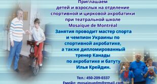 Дорогие друзья, Мы рады сообщить вам, что при театральной школе Mosaïque de Montréal открыто отделение спортивной и цирковой акробатики. Приглашаются и дети и взрослые, желающие в совершенстве владеть своим телом. Занятия проводит мастер спорта.