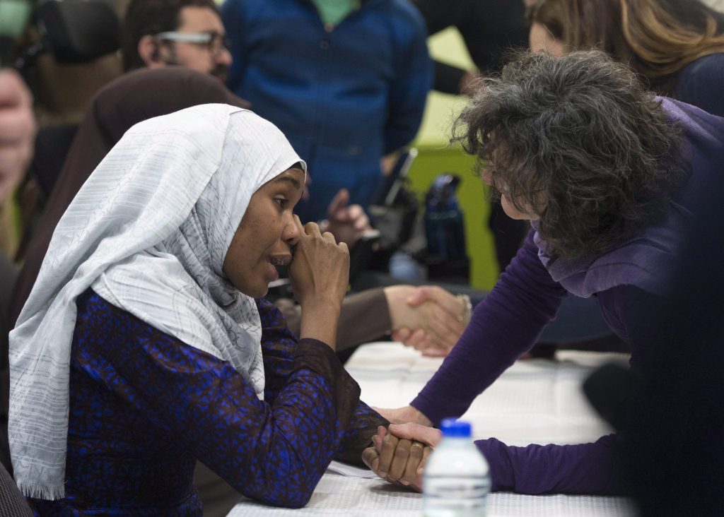 Idiatou Barry, left, wipes her eyes as she speaks with a woman during a gathering at the Centre Islamique de Quebec, marking the first anniversary of the mosque shooting, Saturday, January 27, 2018 in Quebec City. Barry lost her husband, Mamadou Tanou Barry, in the shooting,THE CANADIAN PRESS/Jacques Boissinot
