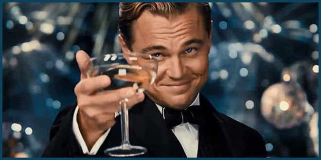 Ди Каприо с бокалом. Кадр из фильма "Великий Гэтсби" (2013), ставший суперпопулярным мемом.