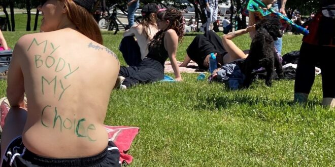 Десятки человек собрались топлес в парке Мон-Руаяль в полдень в воскресенье. Они пытались поддержать Элойзу Пуассон, которой полиция пыталась запретить загорать с голой грудью в конце мая.